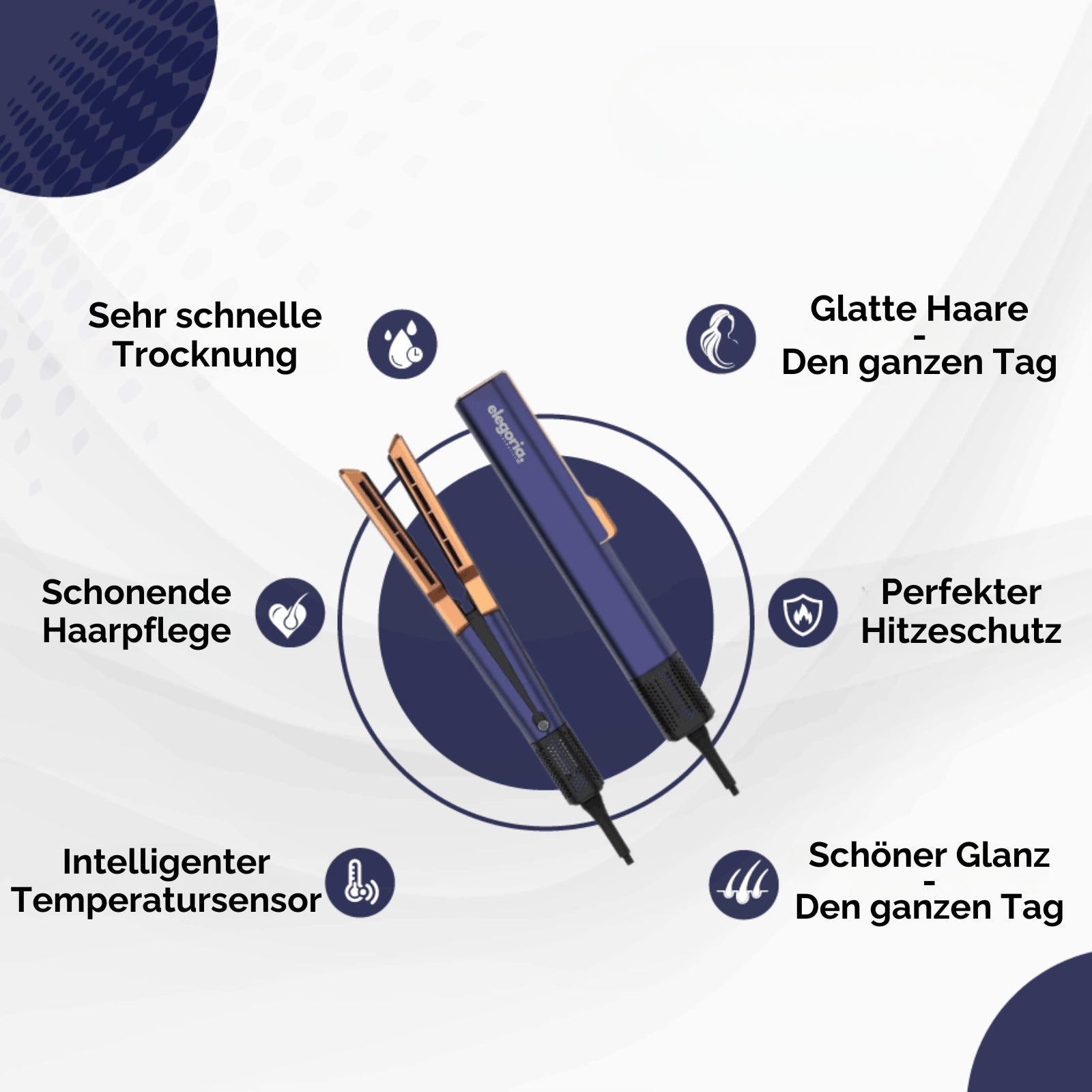 Im Gegensatz zu herkömmlichen Haarglättern, die beheizte Platten verwenden, nutzt der Elegoria™ AirStrait leistungsstarken Luftstrom, um das Haar gleichzeitig zu trocknen und zu glätten. Diese Methode ist für nasses und trockenes Haar geeignet und minimiert Hitzeschäden.